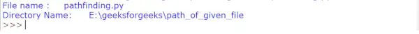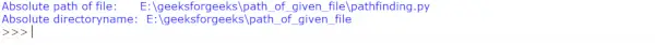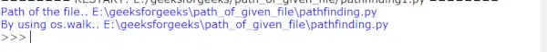 import> os> pythonfile>=> 'pathfinding.py'> # if the file is present in current directory,> # then no need to specify the whole location> print>(>'Path of the file..'>, os.path.abspath(pythonfile))> for> root, dirs, files>in> os.walk(r>'E:geeksforgeekspath_of_given_file'>):> >for> name>in> files:> > ># As we need to get the provided python file,> ># comparing here like this> >if> name>=>=> pythonfile:> >print>(os.path.abspath(os.path.join(root, name)))> |